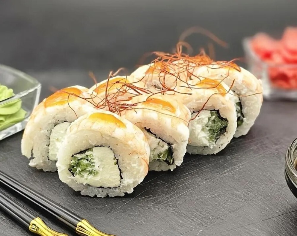 Рис, нори, сыр креметте, огурец, тигровая креветка, нити чили, соус манго-чили