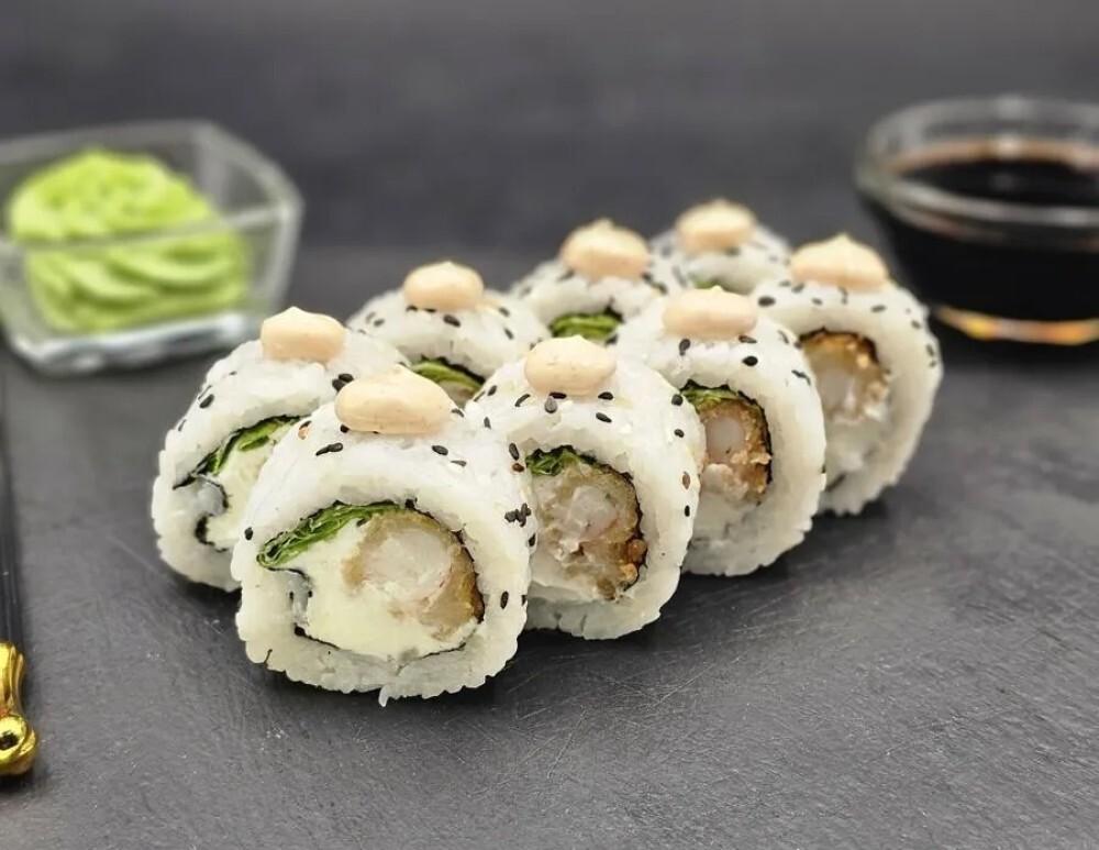 Рис, нори, сыр креметте, креветка тигровая в темпуре, лист салата, кунжут, спайси соус, темпура