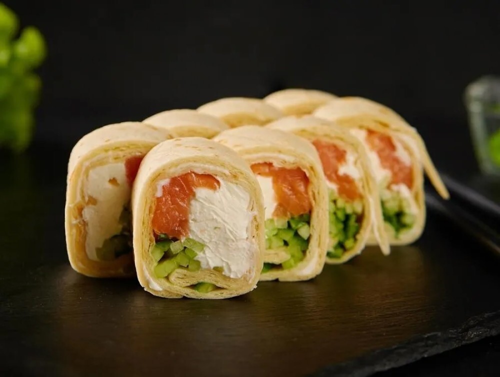 Сыр креметте, филе лосося, свежий огурец, лепёшка тортилья