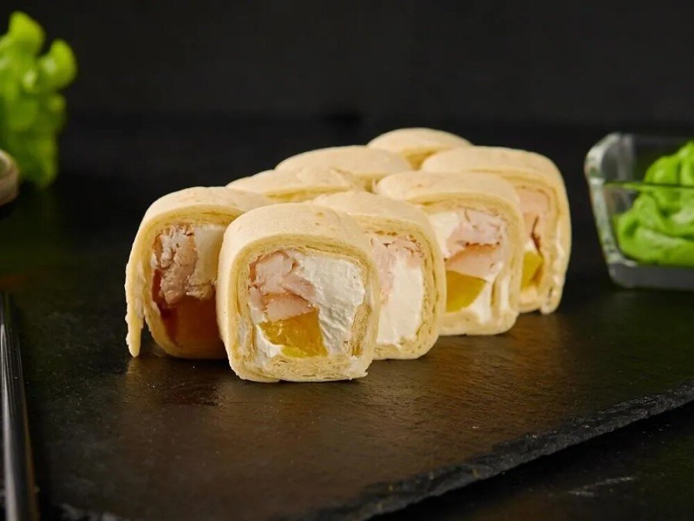 Сыр креметте, филе куриной грудки копчёное, ананас консервированный, лепешка тортилья