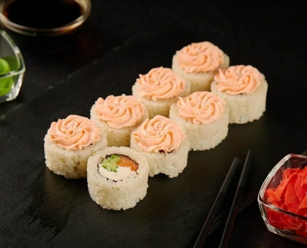 Рис, нори, филе лосося, икра масаго, свежий огурец, сыр креметте, майонез, соус кимчи