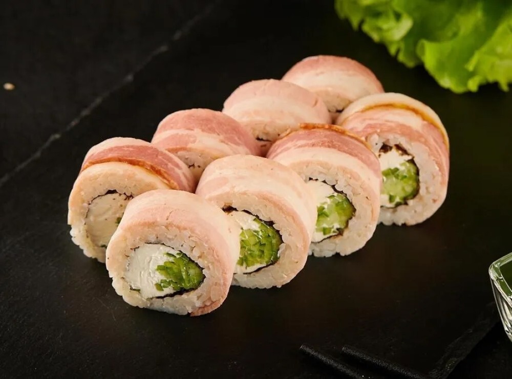 Рис, нори, сыр креметте, свежий огурец, бекон сырокопченый, соус терияки