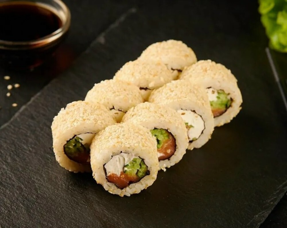 Рис, нори, сыр креметте, филе сёмги, свежий огурец, кунжут