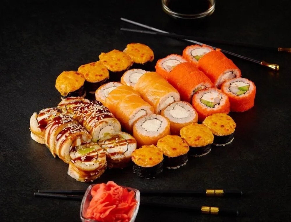 Филадельфия с огурцом (8 шт.), Лава с лососем (8 шт.), Бекончик (8 шт.), Чизи запеченный (8 шт.)