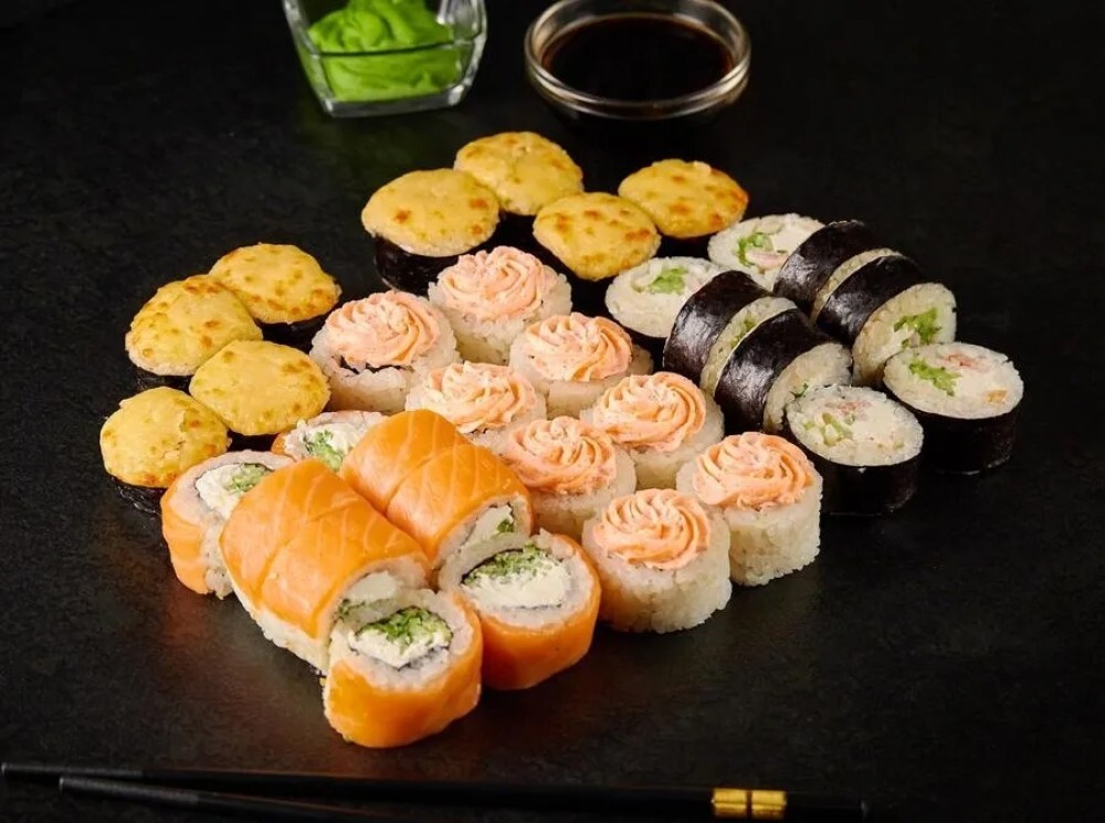 Филадельфия с огурцом (8 шт.), Лава с лососем (8 шт.), Бекончик (8 шт.), Чизи запеченный (8 шт.)