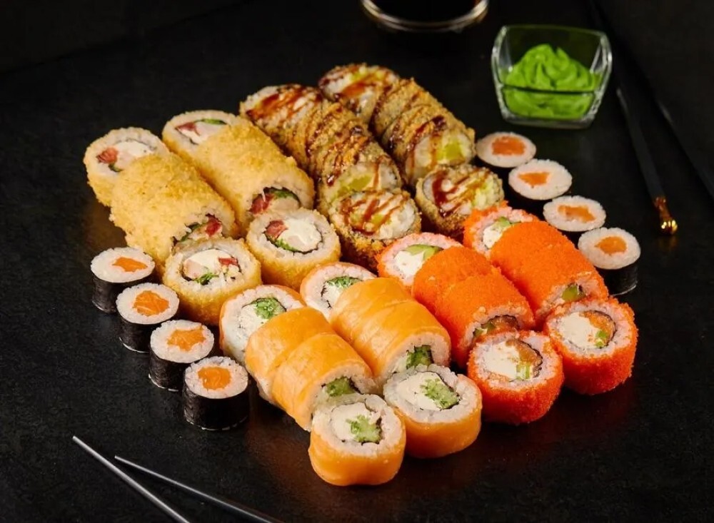 Филадельфия с огурцом (8 шт.), Калифорния с лососем (8 шт.), Унаги темпура (8 шт.), Тори темпура (8 шт.), Сяке маки (8 шт.)