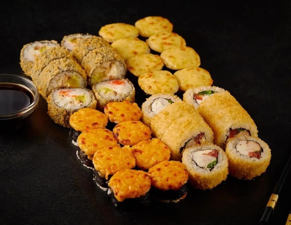 Тори темпура (8 шт.), Окинава темпура (8 шт.), Сяке запеченный (8 шт.), Чизи запеченный (8 шт.)