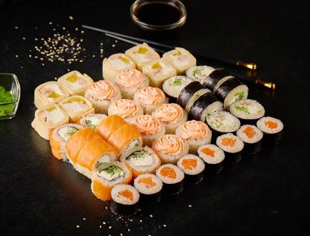 Филадельфия с огурцом (8 шт.), Лава с крабом (8 шт.), Тортилья с курицей (8 шт.), Бекончик (8 шт.), Сяке маки (8 шт.)
